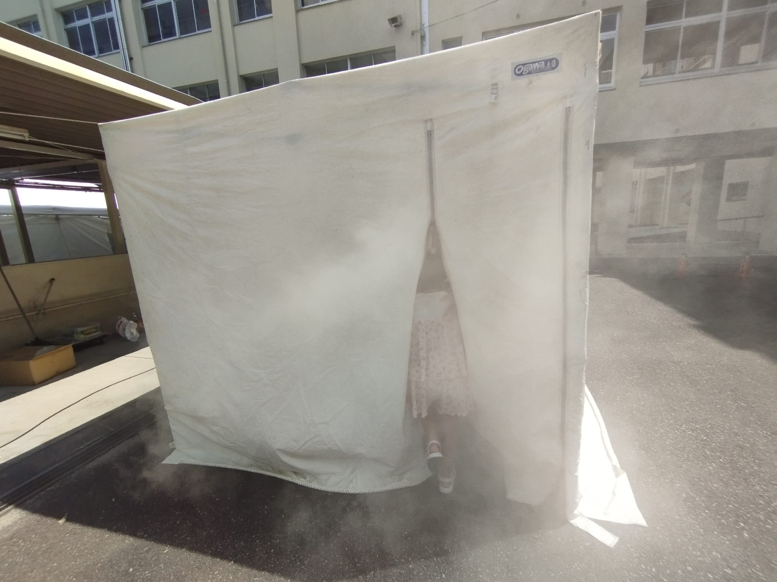 お次は「煙テント体験コーナー」に行ってきました。煙テントは人が吸っても害のない煙で満たされたテントの中を歩き、実際の火事の現場を想像して体験することができました。煙テントの中は白い煙で充満しており全く前が見えず大人でも怖い状態でした。消防局のお姉さんに付き添って貰ってゴールまで辿りつくことができました。 (協力:西成消防局)