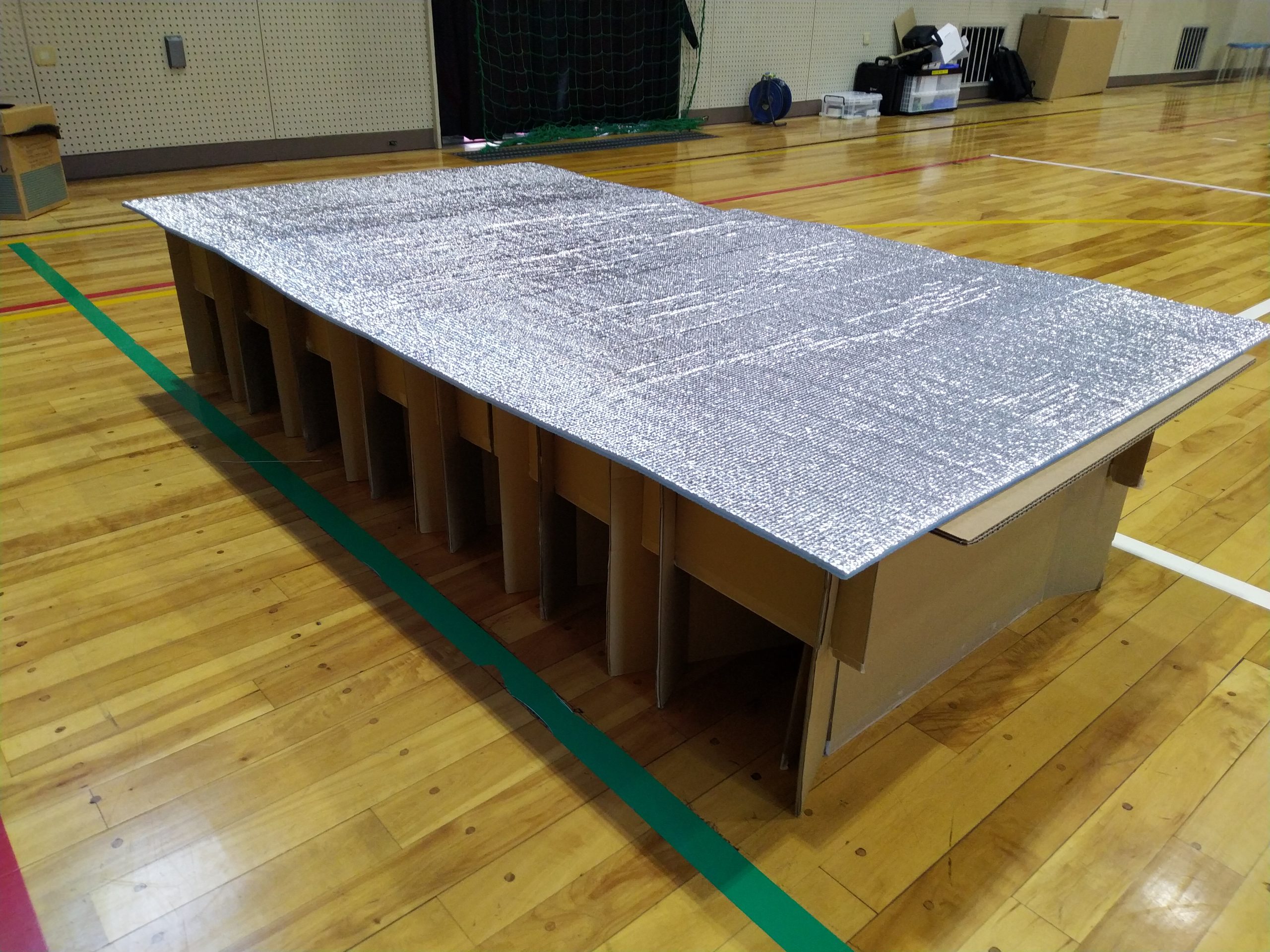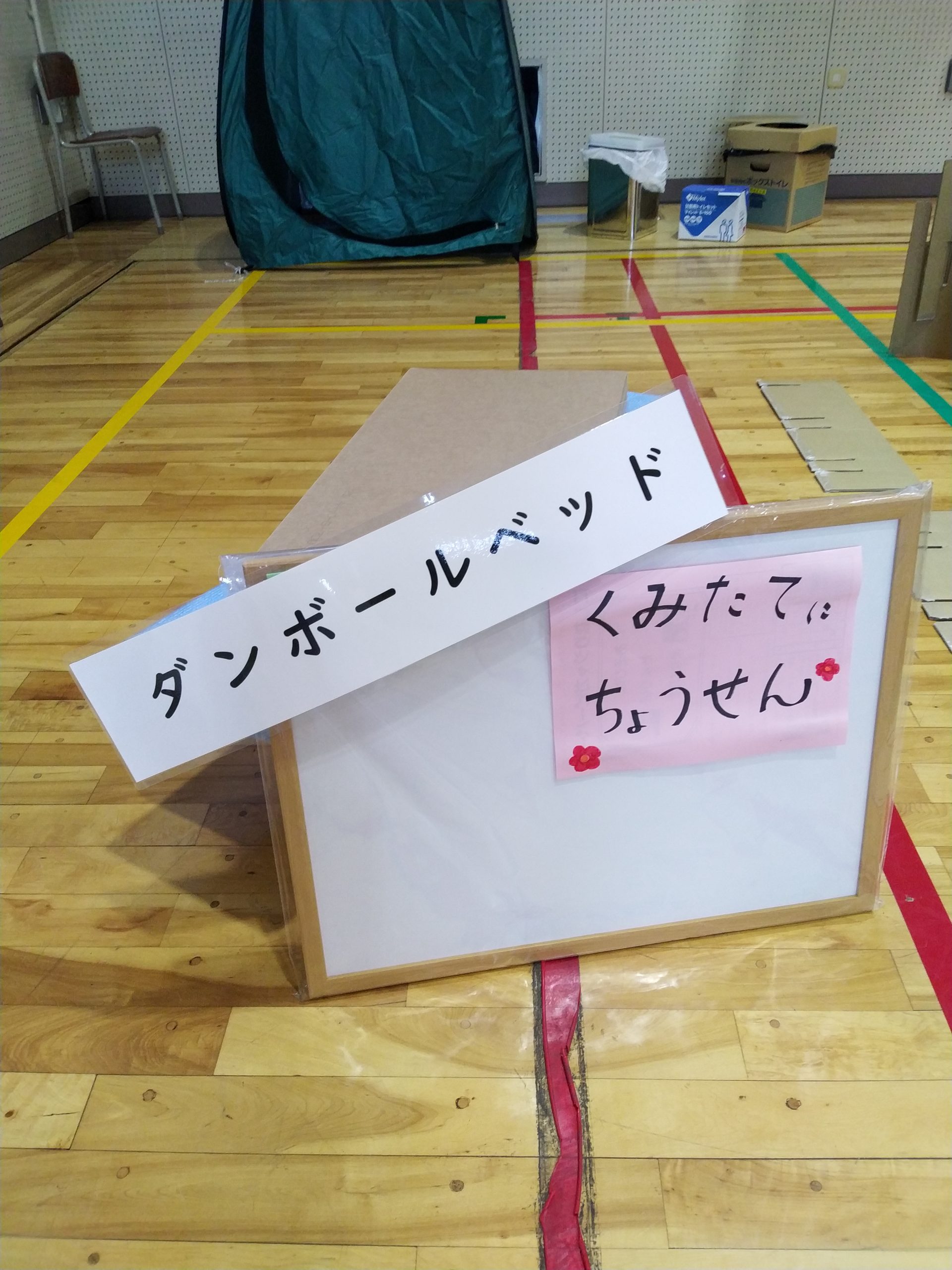 - 段ボールベッド組み立て挑戦コーナーで段ボールを素早く展開する